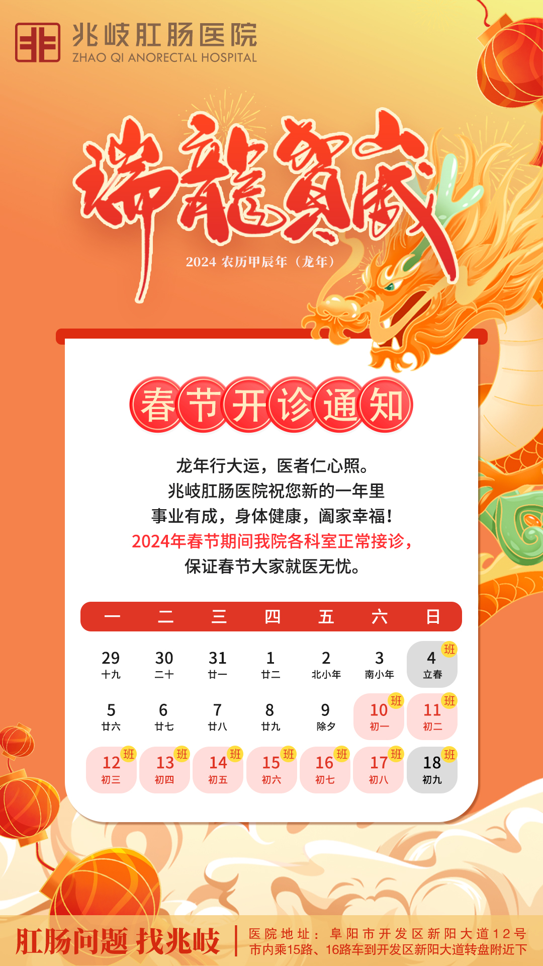 春节假期期间,凡出现大便带血、肿物脱出、肛门疼痛、肛门周围有小疙瘩或有异物感、肛周瘙痒、潮湿、大便困难、干燥、大便形状改变、腹痛、腹泻等症状,可关注医院微信公众号进行免费咨询。