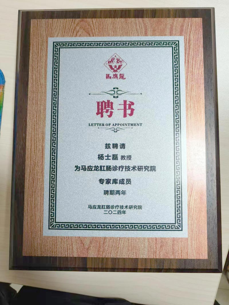 杨士磊教授为马应龙肛肠诊疗技术研究院‘专家库成员’(聘期两年)”的牌子和聘书,交给了阜阳兆岐肛肠医院杨士磊院长手中。从而填补了马应龙肛肠诊疗技术研究院在皖北地区乃至安徽省“专家库成员”的空白。