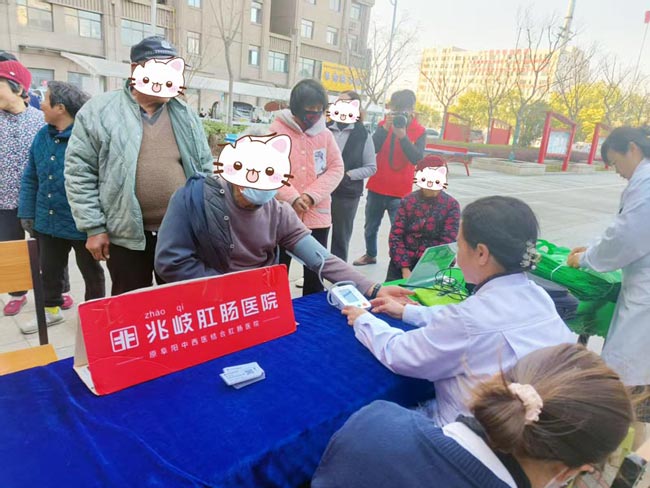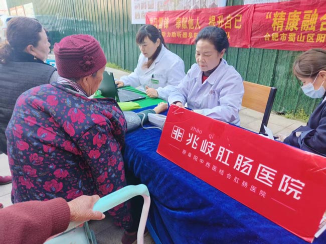 阜阳兆岐肛肠医院志愿者服务队的成员,现场为附近居民测量血压,解答居民疑问,针对一些血压异常者给予个性化健康指导。活动现场发放健康手册及小礼品,将实用医疗知识送入千家万户。